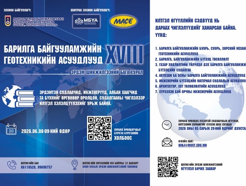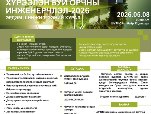 Тогтвортой хөгжил, хүрээлэн буй орчны инженерчлэл-2026 эрдэм шинжилгээний хуралд эрдэмтэн судлаачид, инженерүүд, мэргэжилтнүүд та бүхнийг судалгаа, эрдэм шинжилгээ, инженерийн бүтээлээ ирүүлэхийг урьж байна.