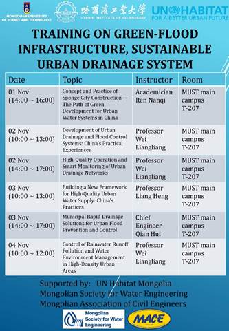 ШУТИС, БАС-ийн Инженерийн байгууламжийн тэнхим, НҮБ-ийн Хабитат Монгол хөтөлбөрийн дэмжлэгтэйгээр Харбины Технологийн Их сургуулийн Хүрээлэн буй орчны сургуулийн Дэд захирал Вей Лианглианг, багш Шионг Тинг, Хятадын Инженерүүдийн академийн Академич, Хабрины Технологийн их сургуулийн Дэд ерөнхийлөгч асан, Профессор Рен Нанчи, Шанхайн Каикуан насосны үйлдвэрийн төлөөлөлийг урьж 2025 оны 11 сарын 1 – 2025 оны 11 сарын 4 – ийг хүртэл чадавхжуулах сургалт, уулзалтуудыг зохион байгууллаа. Зочин профессоруудын айлчлалын үеэр Монголын усны инженерчлэлийн мэргэжлийн холбоо, Монголын барилгын инженерүүдийн холбооны хамтран Усны инженерүүдийг чадавхжуулах “Үерийн ногоон дэд бүтэц ба тогтвортой ус зайлуулах систем” 4 хоногын сургалтыг төрийн мэргэжилтэнгүүд, зөвлөх үйлчилгээний компаниудын инженерүүд, их сургуулийн багш нарт зориулан зохион байгуулав. Сургалтад нийт 50 гаруй хүмүүс хамрагдаж Хятадын шингээгч хотын туршлага, нүүрс төрөгчийн бага ялгаралтай, байгальд ээлтэй хот байгуулалтын усны дэд бүтцийн талаар шинэ ойлголт, мэдлэгүүдээс суралцав.