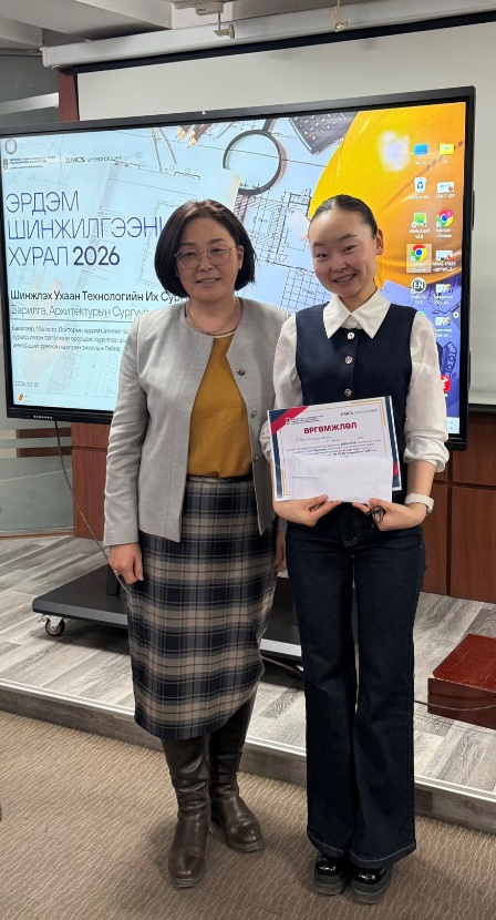 Дэд байрыг АТ-ийн ахлах багш Н.Нарантуяа удирдагчтай Л.Энхжаргал, Б.Сэргэлэн, М.Соронзонбат нарын “Орон сууцны харьяа хүүхдийн тоглоомын талбайн төлөвлөлтийн норм дүрмийн хэрэгжилтийн судалгаа” сэдэвт илтгэл;