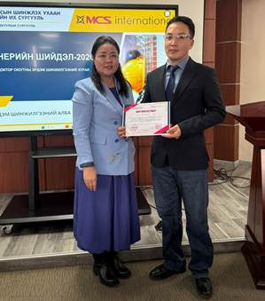 Тэргүүн байр эзэлсэн докторант Д.Золжаргалд өргөмжлөл, кредитийн урамшуулал, ивээн тэтгэгч байгууллага М СИ ЭС Интернэйшнл ХХК-н мөнгөн тэтгэлэг болох 700 000 төгрөгийг гардуулав.