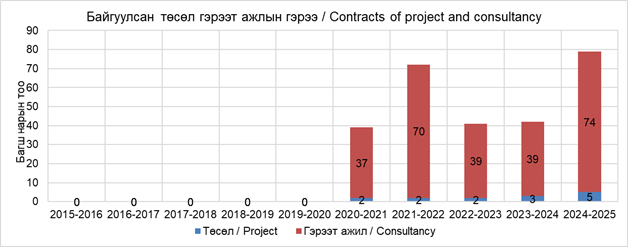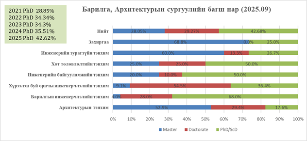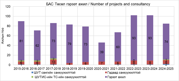 Барилга Архитектурын Сургуулийн профессор, багш нар БШУЯамны Шинжлэх ухаан технологийн сан, ШУТИС-ийн Технологийн сан, Европын холбоо, Каритас Чех ОУ-ын байгууллага, НҮБ, Дэлхийн зөн, Азийн хөгжлийн банк, KОЙКА олон улсын байгууллага, Гадаад Хамтын Ажиллагааны Агентлаг JICA, Инженер технологийн дээд боловсролын төсөл зэрэг гадаад, дотоодын байгууллагуудын санхүүжилтэй төсөл хөтөлбөрүүдийг хэрэгжүүлж байна.