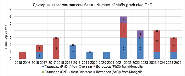 2025 оны 02 дугаар сарын 20 өдрөөс эрдэмтэн нарийн бичгийн даргаар доктор (PhD) Г.Адъяажав, 2025 оны 08 дугаар сарын 18-наас эрдэм шинжилгээ, инновац хариуцсан ажилтнаар О.Батмөнх ажиллаж байна.
