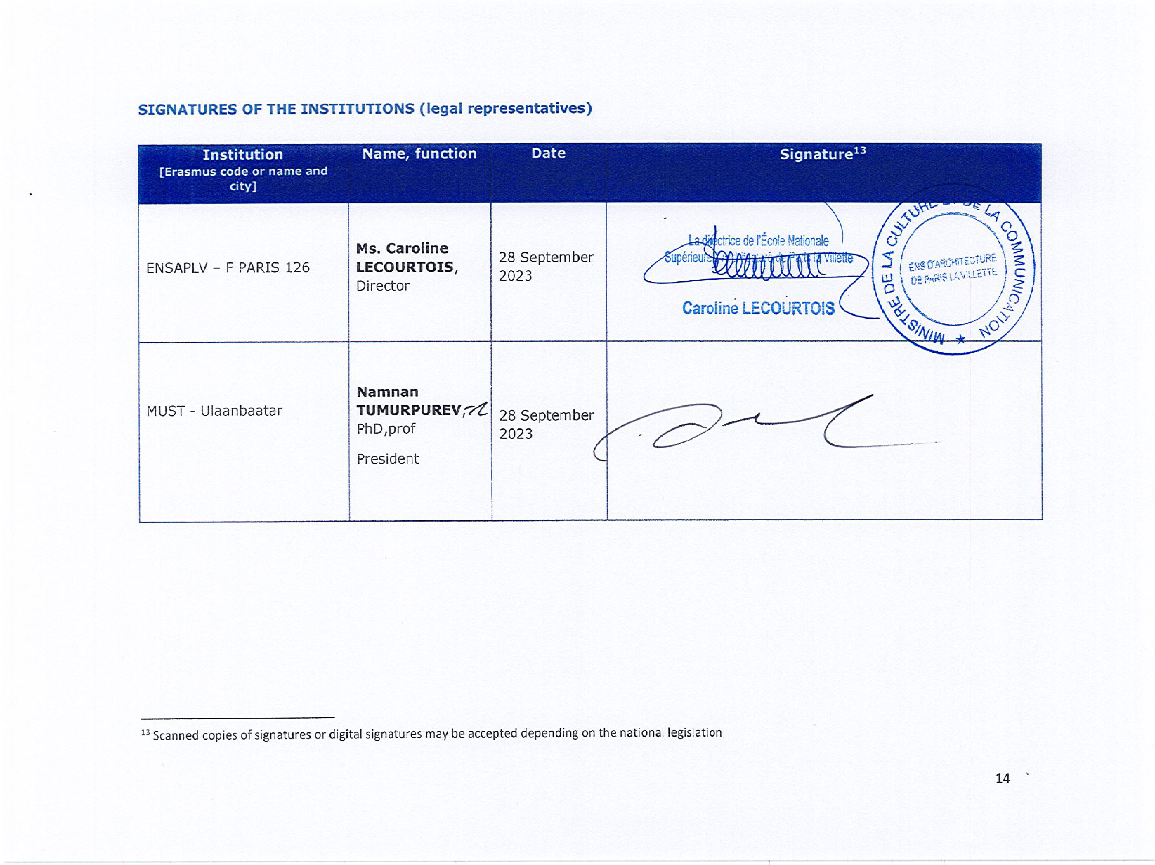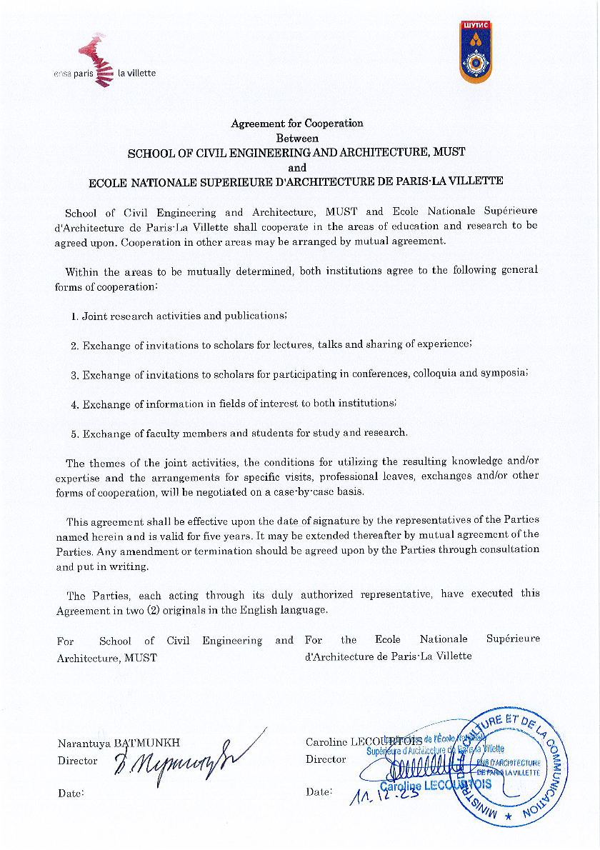 Барилга Архитектурын Сургууль болон Парис хотын Ла Виллетийн Архитектурын Үндэсний Сургуулиуд нь хамтын ажиллагааныхаа цар хүрээг өргөжүүлж  Европын Холбооны ERASMUS төслийн 93,000 еврогийн санхүүжилттэйгээр Архитектур, Хот төлөвлөлтийн тэнхмийн хөтөлбөртэй хамтран 3 жилийн төсөл хэрэгжүүлэхээр болж 2023.09.28-ны өдөр хамтын ажиллагааны санамж бичигт гарын үсэг зурсан. Уг үйл ажиллагааны хүрээнд Барилга Архитектурын Сургуулийн Архитектурын хөтөлбөрийн 5-р дамжааны 2 оюутан болох О.Эрдэнэбаяр, С.Гүнбилэг нар оюутан солилцооны тэтгэлэгт хөтөлбөрт шалгаран нэг жилийн хугацаанд Ла Виллетийн Архитектурын Сургуульд суралцаад ирсэн бөгөөд 2025.08.30-ны өдөр Архитектурын хөтөлбөрийн 5-р курсын дамжааны оюутан М.Цэлмүүн, Хот ба бүс нутгийн магистрын хөтөлбөрийн магистранд Ч.Батчимэг нар нэг жилийн хөтөлбөрөөр суралцахаар Франц улсыг зорьсон.