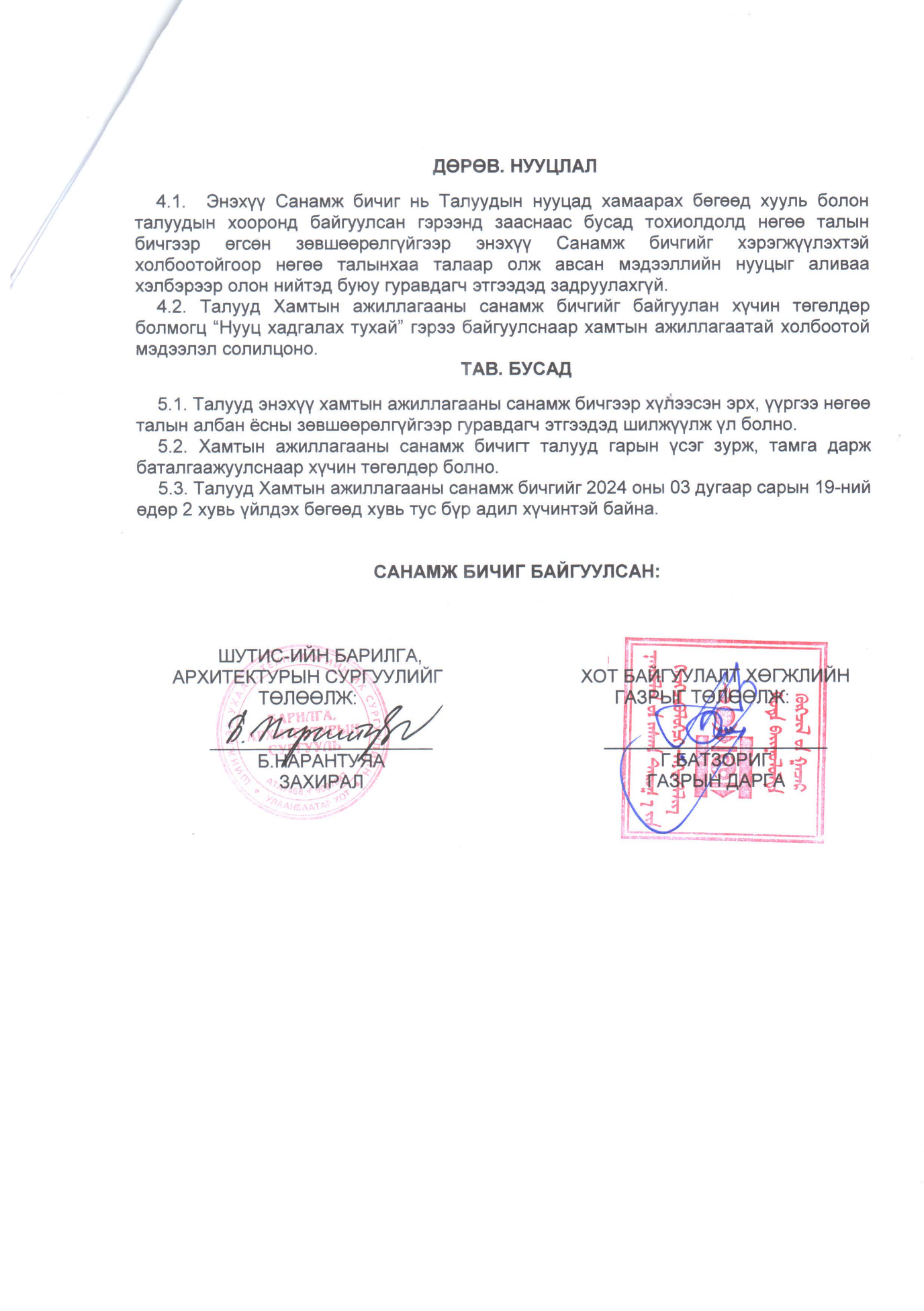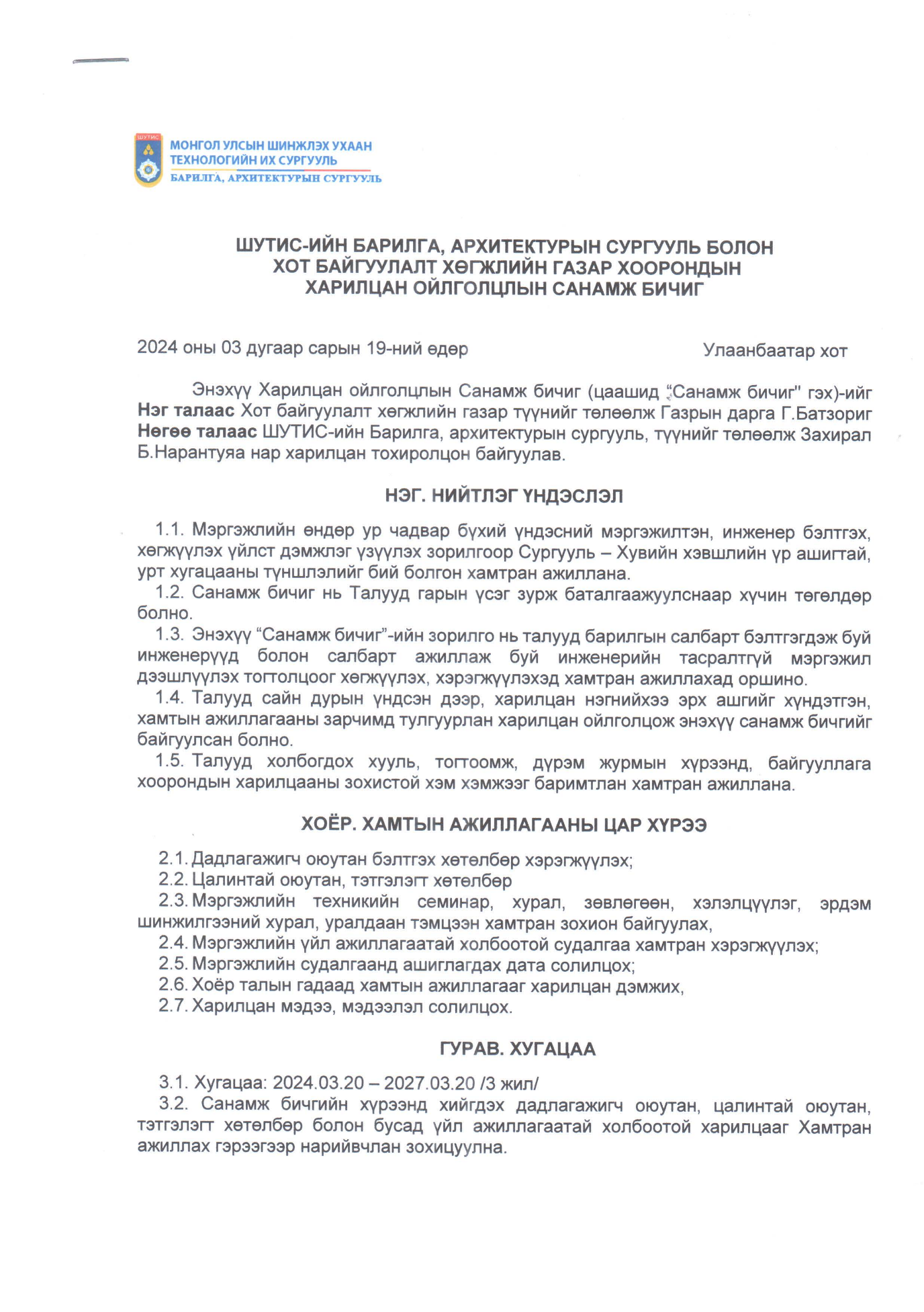 2024 оны 3 дугаар сарын 19-ний өдөр ШУТИС-ийн Барилга, архитектурын сургууль болон Хот байгуулалт хөгжлийн газар хамтран ажиллах харилцан ойлголцлын санамж бичиг байгууллаа.